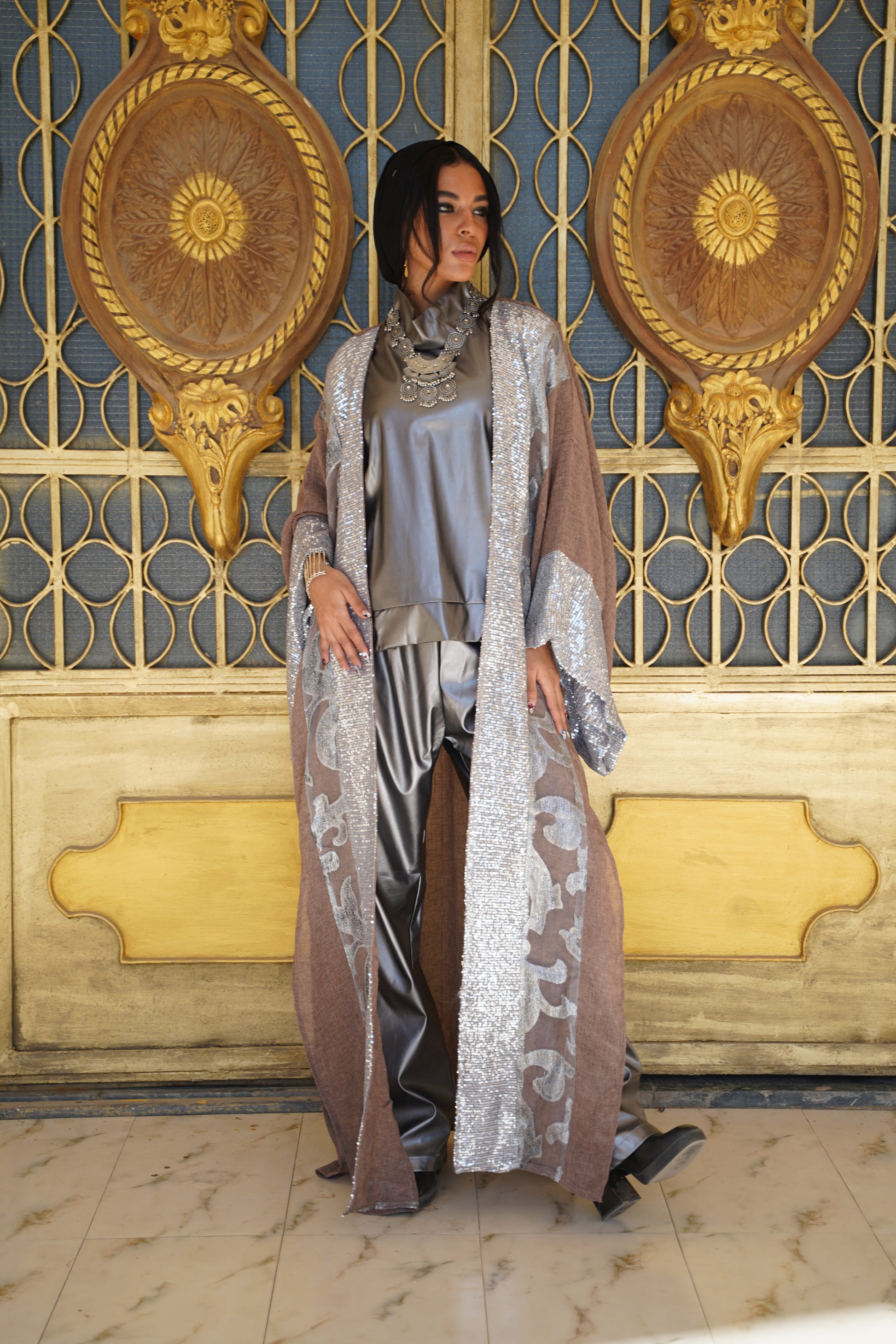 Elegant silver and brown linen kimono designed for special occasions. Features a graceful drape, refined color contrast, and breathable fabric—perfect for adding a sophisticated statement to your outfit.